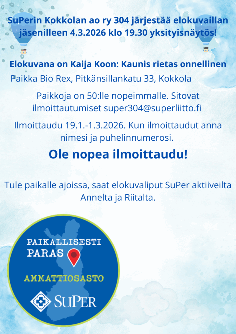 Tervetuloa SuPerin Kokkolan ao ry 304 jäsen 4.3.2026 klo 19.30 elokuvailtaan. Sitovat Ilmoittautumiset 19.1.-1.3.2026 super304@superliitto.fi ilmoita nimesi ja puhelinnumerosi ilmoittautumisen yhteydessä.